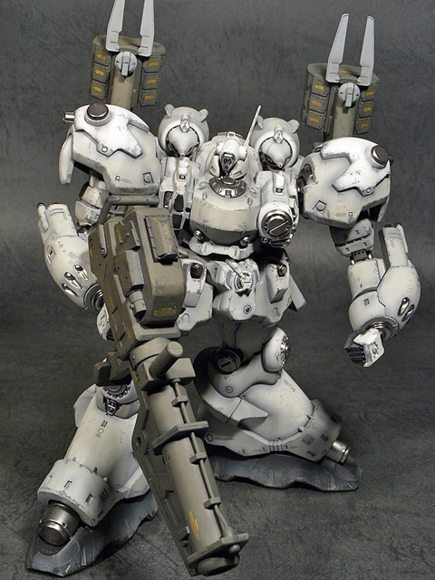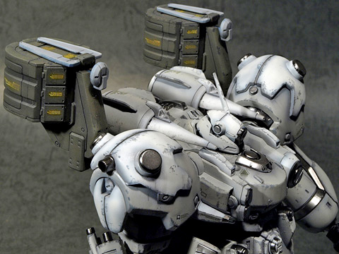 ACの集団戦闘が実現した場合、こうした重装甲、重量級の機体はどんな局面で活躍できるか考察してみたのですが、重装甲という点に着目すると、それを生かして前線に突撃し、多少の損害を省みずに目標を制圧する、といった使い方が出来る様に思えます。左右の背部に装備する『YASYA』を、その形状から6連装ミサイルランチャだと思っていたのですが、これを一斉発射して目標を包み込み、その間に接近、弾体の飛翔速度で不利になりがちな右手の携行砲、ここでは勝手に180mm程度のガンランチャだと思っているそれを使って一撃を加える、といった戦い方を妄想しています。自衛用にプラズマトーチを装備させようかと思ったのですが、この機体の腕は、腕部装備が似合わないので省略しています。