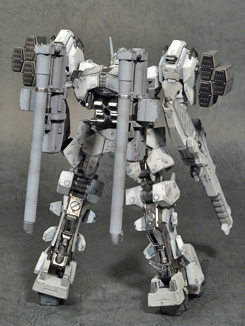 ACの集団戦闘が実現した場合、後方から遠距離の支援射撃を加える役割の機体が存在するのではないかと想定した機体です。遠距離からグレネードを投射、もしくはライフルで狙撃を行い、目標に接近されそうになったらミサイルで牽制してまた距離を取る、といったシーケンスを妄想しています。弾倉が見当たらない事からプラズマガンだと思い込んでいた『CR-WR76RA』が狙撃を、『CR-E90AM2』が自律的に投射できるのか、どちらも解らないのですが。