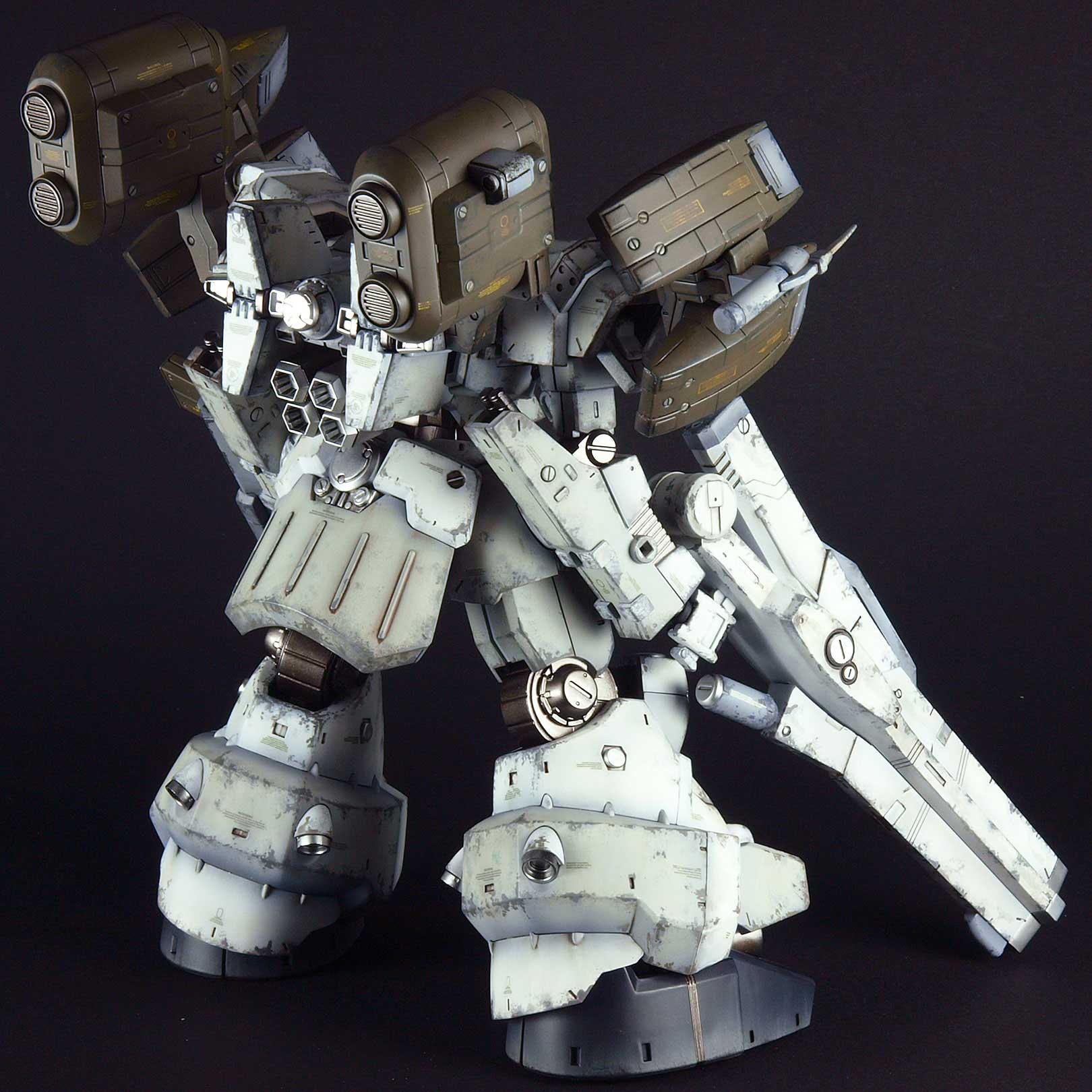 『3』系キットとしては9番目に発売されたもの。既にこの時点で『4』系キットが発売になっており、それらと並行しての展開となっていた時期の製品です。第3弾の『ミラージュ C05-SELENA』に続いての『重量級AC』のキットでかなりのボリュームを誇る構成になっています。どうやら元デザインについて、所謂『ハイエンドCG』が存在しないらしく、他キットよりディティール類が少なめで、若干あっさりした印象のある製品になっています。とはいえ河森さんデザインが確認されているコア部、また恐らくはこちらも河森さんデザインであろう脚部のダクト類の複雑な面構成などナカナカに魅力的なパーツが揃っています。武装も肩装備が無いものの右手、左腕、背部と大型の物が付属しかなり迫力あります。