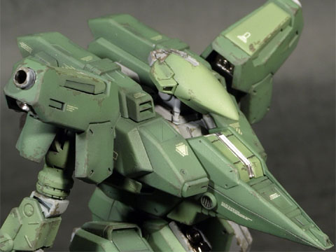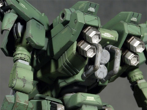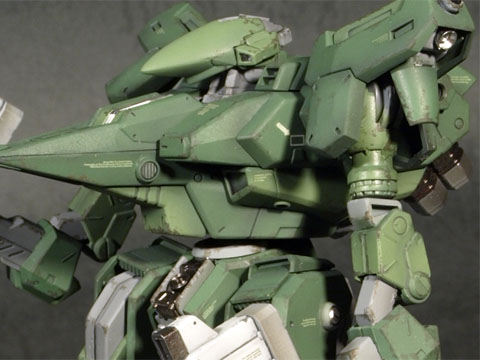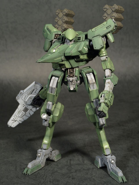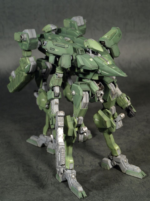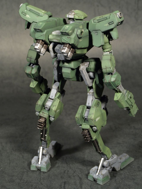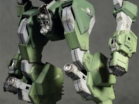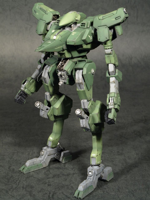 『アーマードコア・プロジェクトファンタズマを一生遊ぶ本』に収録されている設定画稿はコピックで着彩されているので、コピックを使って塗ると設定そのものの色合いが再現できそうな気もするのですが流石に無謀なので普通に塗装してあります。色のイメージは『ガンダム・センチネル0079』版のザクIIの薄緑(黄色系顔料の無いビリジアン系の緑色)なので、GSIクレオスのMGザク2.0用を使ってみたのですが、イメージと全く異なっていてダメでした(そもそもMGザク2.0用は濃淡2色の緑の色調に差がありすぎます。同系色の濃淡といった具合ではありません)。これを使う前にはクレオス#312のグリーンFS34227と#319薄松葉色の印象があったのですが、実際に塗ってみたらコレでイメージにピッタリでした。薄緑部分に#312、濃緑部分に#312と#319を混色したもの、影色として#302グリーンFS34092を吹いています。関節などグレーの部分は「メカ部分は暗色だと整備し辛く、白だと汚れが目立ちすぎる」という考証(?)から明度を高めにして#306グレーFS36270を吹きました。