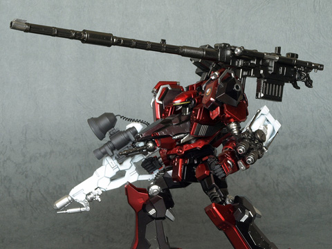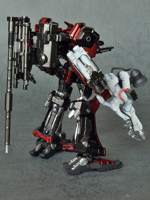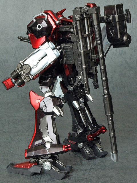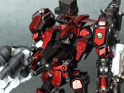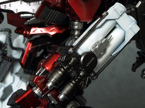 腕パーツが『CR-A71S2』なのは、単純に現在ACVIで発売になっている腕パーツの中で個人的に最も格好良いと思っているからです。この腕パーツは、コアへの取り付け軸の位置の関係上、かなりの「怒り肩」になるので、大変に気にいっています。また、コアパーツの『CR-C98E2』と組み合わせると、頭部パーツが埋まった様なシルエットになって迫力が増す様に思えます。肩には初代『ナインボール』準拠のエンブレムを入れてみました。