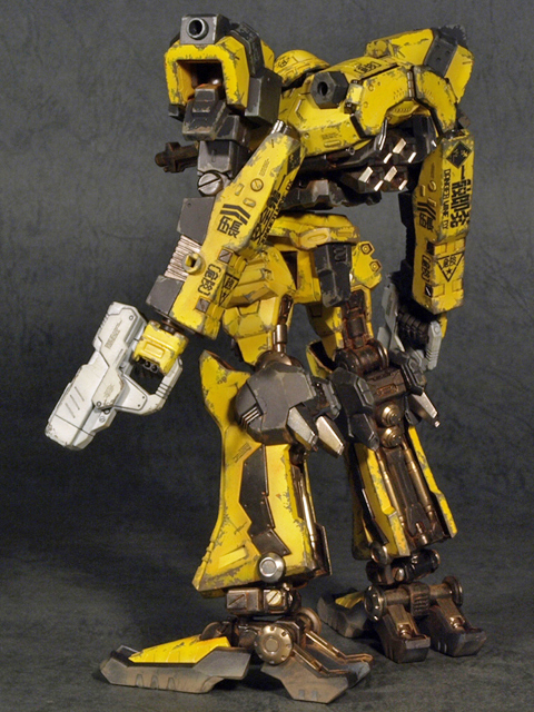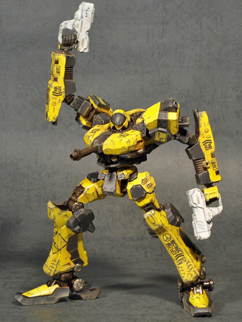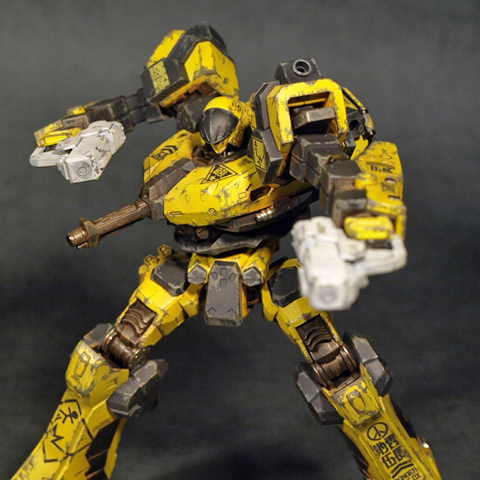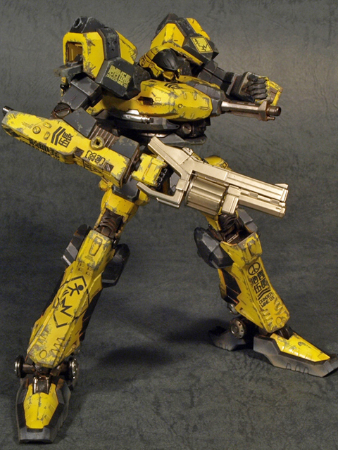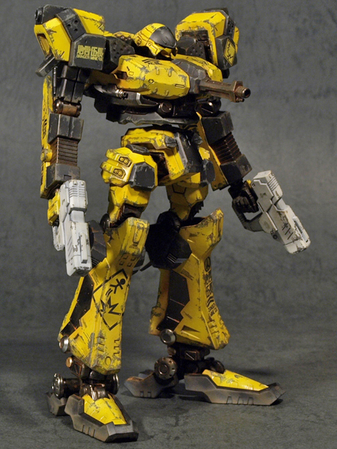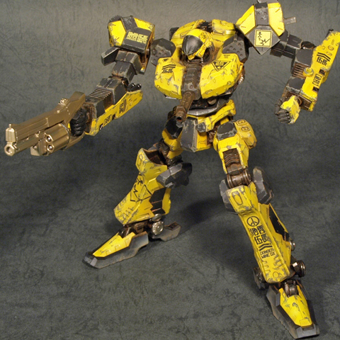 基本的に近似のパーツを使ってアセンブルしたのですが、頭部とコアは似たものがあるのですぐに決められたものの、腕と脚に関しては若干悩むところです。脚は割と標準デザイン的なCR-LH80S2を使用、ただし、足首部分のユニットを間引いて貧弱なシルエットにしました。ここを省略する事で、初代ACのデザインのシルエットに近くなったと思います。ちなみにこの改造を行うと足首の可動範囲が飛躍的に広くなると云うオマケがついてきます。尤も、ポリキャップが丸見えになりますが。腕に関しては、デザインラインが非常に単純なCR-A72Fを使用する事にしました。面が単純であるが故にマーキングを入れる部分が多く、特に肘から下にはいろいろとデカールを貼って楽しめました。部分的に細かなパーツを間引いて、「パーツが足りていない、修理が(予算の関係で)追いついていない」といった雰囲気を演出してあります。
