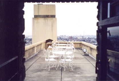 4階には礼拝堂のモチーフでデザインされた、 ライトならではという食堂があります。 その食堂からは、 芦屋を一望できるバルコニーが南へのびています。 写真で見たときは、 「バード・ウォーク」のような 細長い形状を想像してましたが、 実際にはテーブルと椅子をおいても ゆったりできるほどの幅がありました。 |