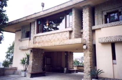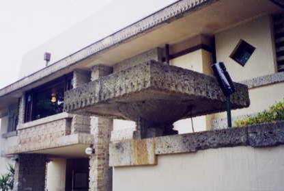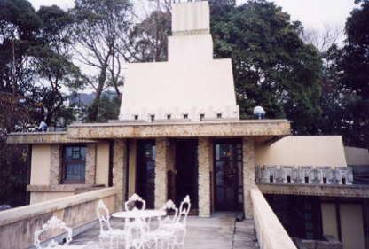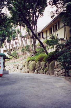 敷地内へ入り、 建物の東側面を眺めつつ 玄関へ至る坂を上っていきます。 もうこのあたりからすでに ライト・マジックの雰囲気が漂っています。 外観の意匠は、同時期に設計された名建築、 「立葵の家(バーンズドール邸)」に似ています。 |