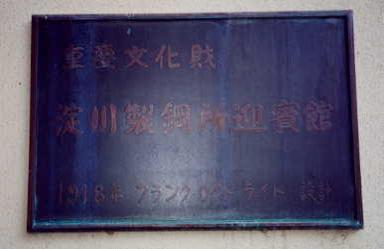 車道からの入り口に掲げられた 淀川製鋼所迎賓館のプレート。 鉄筋コンクリート造の建築物としては、 我が国初めての重要文化財です。 |
