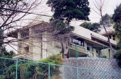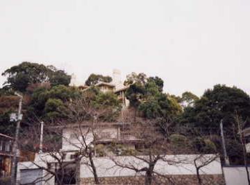 南西側からの撮影です。 きれいに撮れませんでしたが、 芦屋の小高い丘の上、 木々に埋もれるように建っています。 この建物が如何に傾斜のきつい土地に 造られているのかお分かりでしょうか。 |