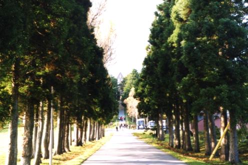 玄関まで数百メートルの直線が続く、杉とポプラの並木道・町道トラピスト通線 |