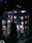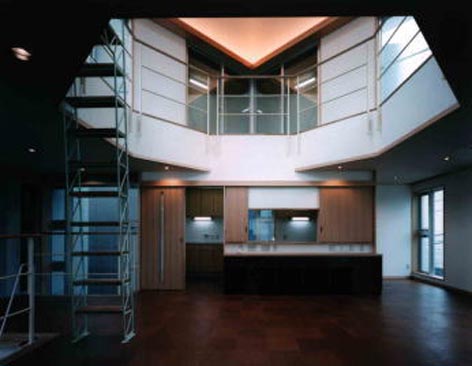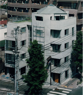 | 敷地は豊島区雑司が谷の小高い丘の頂上にあり目白通りの交差点に面する。門前町の風情と鬼子母神が近くにある当敷地に「人と都市との自然のコミュニケーション」をテーマに店舗・共同住宅複合施設を設計した。2階ピロティーには、家主と店子のためのコミュニケーションスペースを作った。トップライトを利用した三層吹き抜の施主住宅と賃貸3室は、地下の蓄熱槽と北側の二重壁を通じて熱交換するパッシブソーラーハウスであるとともに、屋上緑化および雨水利用などによる環境共生住宅である。 |