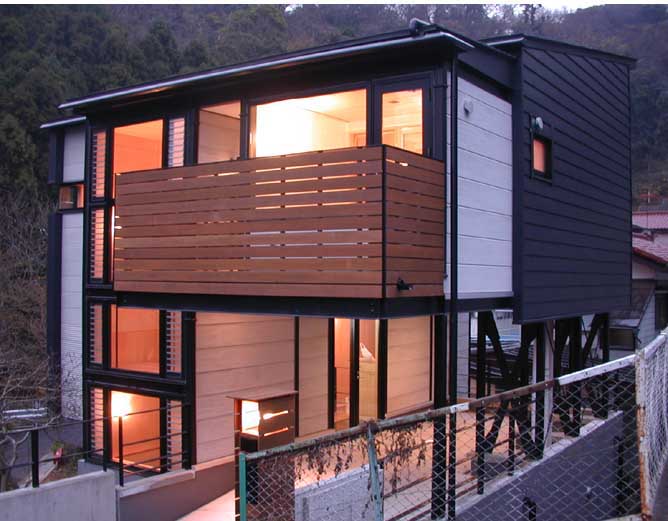 東には自然の美しい風景、北には遠方に山谷が見え、南西には民家が迫るので上部から光と風を取り込んだオ−プンな環境共生住宅である。