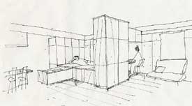 結果として全戸に奥行き2m、幅5mのバルコニ−と2650mmという高めの天井、床下収納を兼ねたプラットホ−ムによる空間の間仕切り、(壁は設けない)等により建設コストを抑えながら生活空間を最大限に広げる工夫をしている一戸建て感覚の半メゾネット賃貸住宅である。