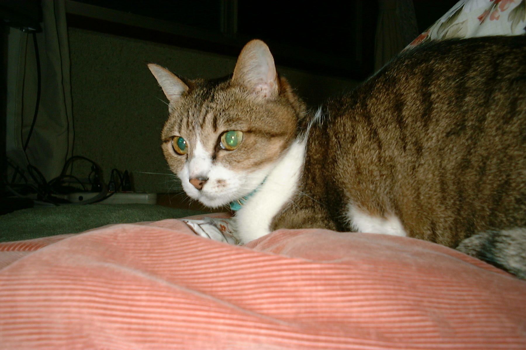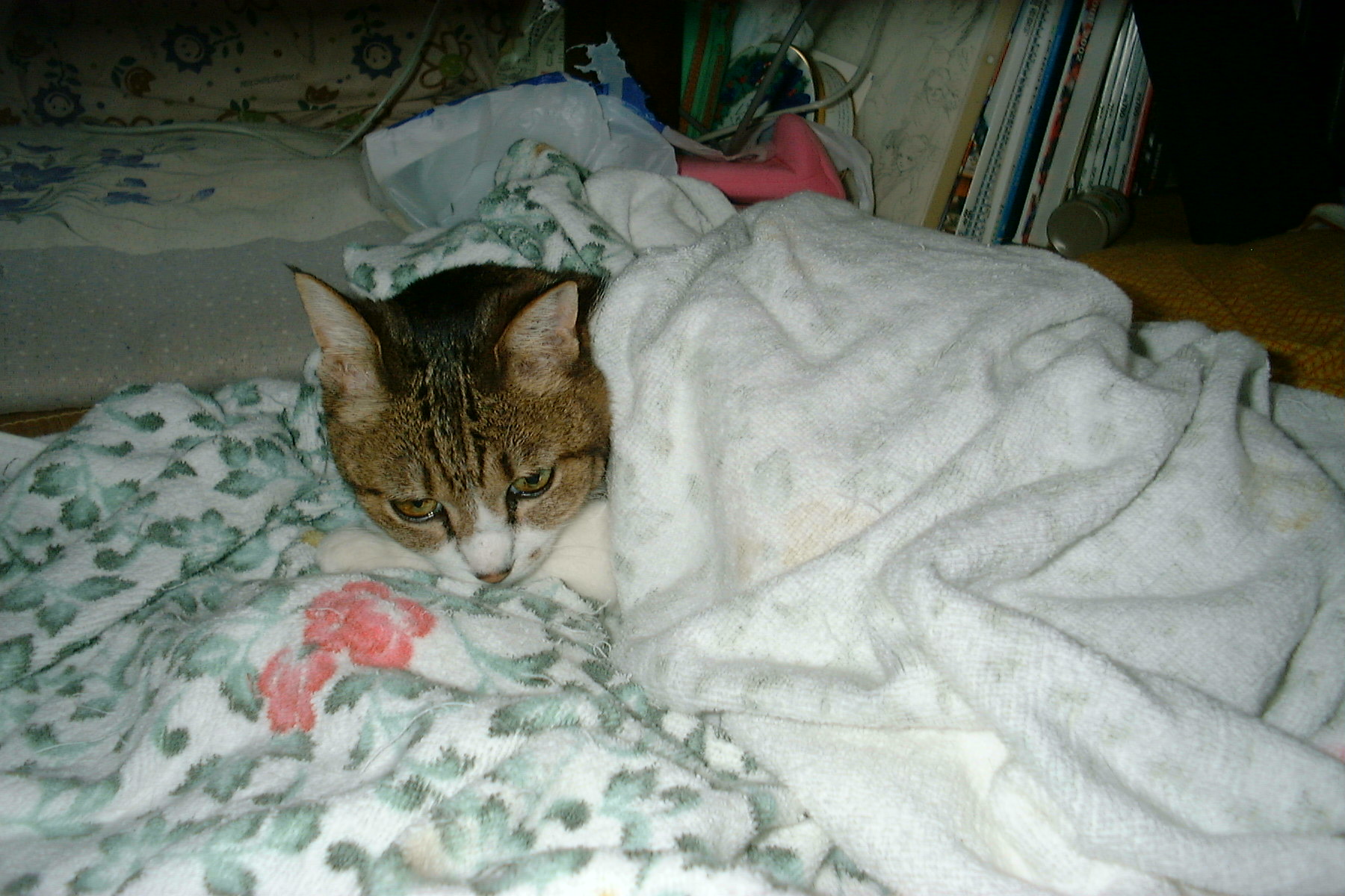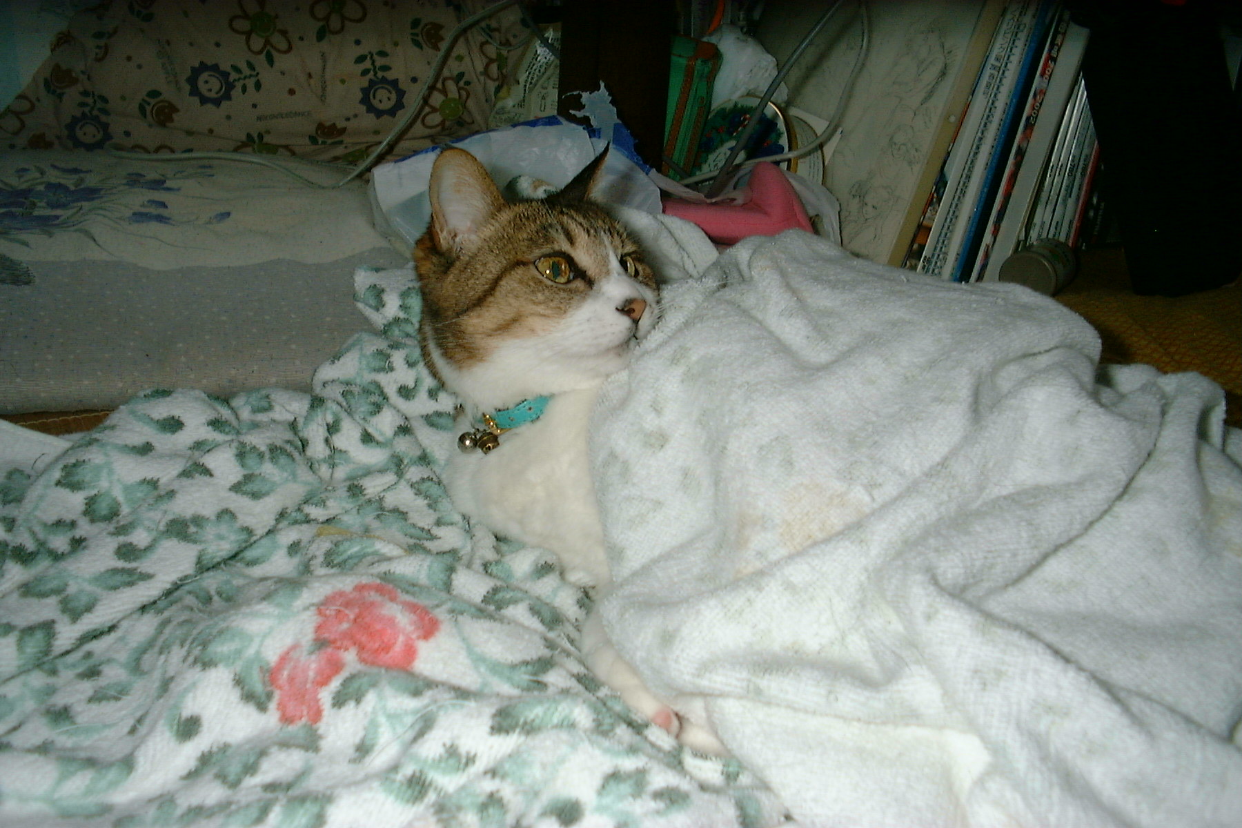 このときは 、片目の調子が悪かったのです。目バチコだったの…。でももう大丈夫。(^。^) 部屋にある、オイルヒーターの上で振り向いてみました。 |
