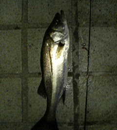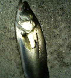 そうこうしながらビルの向かいまで流してきた。すぐ近くには鉄柱の基礎があるはずだからサカナはいるだろうと思ったが。。。 ビルの電気は消えないなあ。なんて思って眺めてた。するとそのとき沖でライズが始まった。慌てて投げる。が空振り。 一回だけじゃない。一斉にあちこちでライズが始まった。なんなんだろ? 釣れるかも!?近いところ遠いところ、1分間に10回以上はあったかもしんない。そのたびに投げるけどアタらない。 もしかしてルアー択んでる?持ち合わせたパワーシラスに替えて投げる。一発で食った!ちょい沖目で食った一匹。ツネスペにゃちと大きい40cm。