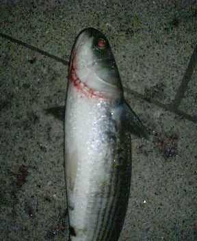 それから橋の下に流したら暗がりでアタリ。今度はえらいトルクフルな引き方をする。スピードは無いけど強い引き。潮が速いから引きも強い。でも暗がりから引きずりだしたら。今度は60センチぐらいありそうな大きいボラ(泣) 重くて抜けないんでライン持って引き上げようとしたらルアーが外れてサヨウナラ。
