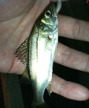 橋の上から投げると結構追ってくる。ホントにいるじゃん!でも食わない。今度は橋の下の暗部に投げる。するとヒット。小さいっ。サッパかと思った。10センチ程度?こんな小さいの初めて釣ったよ。 ところが後が続かない。チェイスするけどバイトしない。10投に1回ぐらいアタリらしき感触はあるんだけどセイゴらしい「コンッ!」って感じじゃなくて「モゾッ」って感じ。活性が低いのかも。