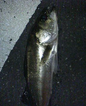 ひとしきりテクトロで往復してから運河にもう一度戻る。 投げても反応が無い。それどころか水面に現れるのはイナっ子の集団。セイゴは追いやられちゃったのかな?それとも時合いが過ぎたのか? パラマックスに付け替えて垂直方向に探ると橋脚のそばだけ追って来るのが見えた。ようやくわかった。サカナの活性が低い。だから水平方向には追ってこない。 というわけでジグヘッドを重めにして橋の上でひたすらフリッピング。シーバスでこんな釣り方するヤツいないよなぁ(苦笑) 何度か橋を往復したところでアタリがあった。見えた姿は30センチぐらいか?お子ちゃまを想定してたから存外な大物だ。でも下に下に引くもんで最初はボラかと思った。一度水面まで上げてみたらしっかりシーバスだったんで慎重にヤリトリするけど引くわりには全然ジャンプしない。 大人しくなったところでゆっくり抜いた。35センチ以上40センチ未満ってところかな。4ポンドでよかった。3ポンドじゃたぶん切れてる。 写真撮って無事リリース。でも上げたら全然暴れないよい子だった。