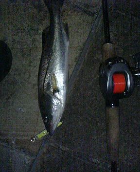 ところが3分としないうちにネガカリ。引っかかるようなところがあったかな?と思いつつサオを煽ってみたら動き出した。 「サカナだ!」 手ごたえは重いけど走らない。ボラか? 巻き取りながら足で距離を詰める。でもって覗き込んだらシーバスだった。30センチ弱ってところ。写真見ればわかる通りでビーフリーズがでかく見える(笑) 屋形船の引き波に乗せて慎重に抜きあげ。 写真撮ってリリースしようとしたらプライヤーを忘れて暗がりでフック外すのに一苦労。自分の指も釣ってしまった(笑)