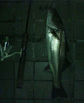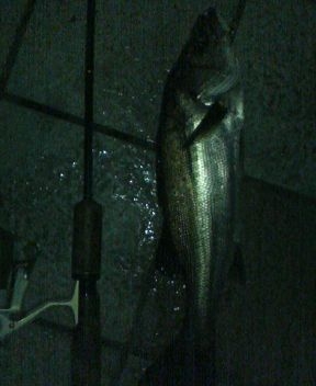 またまたテラスに戻る。もう完全に日が落ちてる。満潮間近で少しだけライズが見える。 何度か投げてると『ギッ!』っとドラグを出すほどの強烈なアタリ。幸いハリに乗らない。 サカナはいるけどデカイなぁ。悪夢が思い出される。