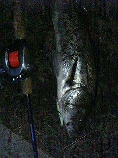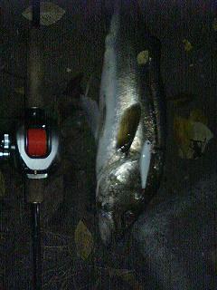 また橋まで戻って壁沿いにキャストすると今度はアタリ。 またアダルトな手ごたえ。 コイツは沖に向かって潜る潜る。全然浮いてこない。しかも走り回る。お前はサバか?(笑) 2分ぐらい格闘して上がって来たのはそんなに大きくない。だけど少々太り気味だ。 弱ったところで簡単に抜きあげたのはやはり45ぐらい。さすがに疲れたらしく、上げたらずいぶん大人しくなった。 すぐにリリースしたらしばらくボーっと浮いてたけど、そのうち水面叩いて泳いでいった。