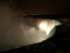 夜のナイアガラ。上流のダムによって滝の水量は抑えられるが、様々なイルミネーションによってライトアップされ、幻想的雰囲気を醸し出す。