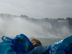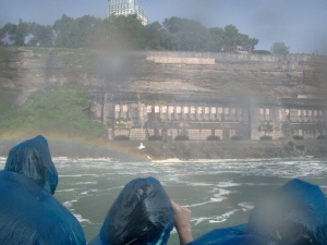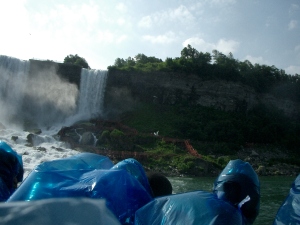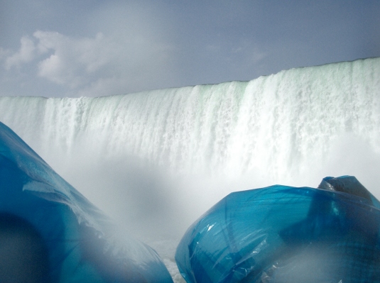 しかし、この滝を眺める上で最もポピュラーで人気の高いアトラクションといえばやはり霧の乙女号でしょう。アメリカ滝の手前から始まってカナダ滝のすぐ麓までを行く船の旅。船上では滝から絶えず落ちてくる水しぶきにさらされるため、乗船時には青いポンチョが配布されます。
