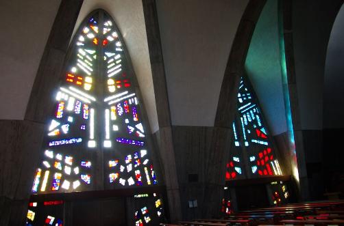ステンドグラスではなく、コンクリート板にガラスを直接埋め込まれています。