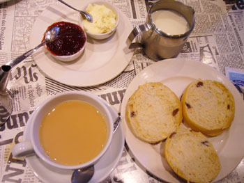 紅茶に生クリームが乗ってるのじゃなく(私は最初そういうのを想像してました)、ミルクティとスコーン、ジャム、クロテッドクリームがセットになったものです。