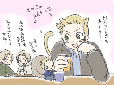 | 「うちのサミーは小さいころは天使みたいに可愛くてなー」 「俺のサムはあれですっごく優しいんだぞ」 「頭もいいしな」 「そうそう、頭もいいし」 「しっかりしてるしな」 「うん、しっかり者だよな」 「インパラ、運転させてくれねえのはちょっと腹が立つけど」 「だよなー、ちょっとくらい触らせてくれたっていいのになー」 「まあでも、それも俺を心配してるからなんだけどな」 「そうなんだよ、俺のためだからさ」 **** サム1「……一見、会話は繋がってるけど……」 サム2「相手の言うこと、聞いてるのかな……?」 |