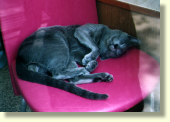 シルバーブルーの被毛と赤い椅子が妙に合ってます。